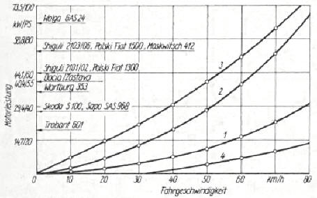 Mehr zum Begriff „Motorleistung" im Kapitel „Anhängerbetrieb in der Praxis". Hier nur noch folgendes: Die Fahrgeschwindigkeit jedes Anhängerzuges wird immer um den Betrag abnehmen, den der Motor des Zugfahrzeugs infolge seiner Auslegung nicht aufzubringen in der Lage ist. Sichtbar wird das daran, dass beispielsweise der Skoda mit seinen 29,4 kW (40 PS) unter den Bedingungen der Kurve 3 im Höchstfalle rund 40 km/h erreicht, während es der WAS 2101 oder der Polski-Fiat 1300 mit ihren 44,1 kW (60 PS) noch auf über 50 km/h Geschwindigkeit bringen. Und das bestätigt unsere eingangs getroffene Feststellung, nach der ein Zugfahrzeug im Anhängerbetrieb mindestens 44 kW (60 PS) besitzen sollte, eben, um in allen Verkehrssituationen zügig mitfahren zu können.